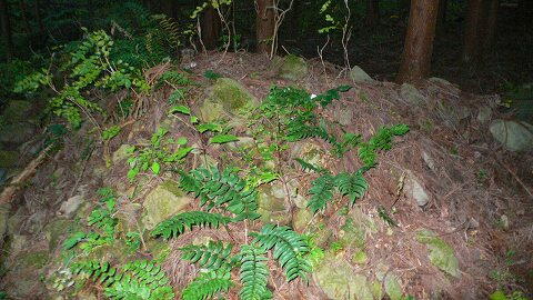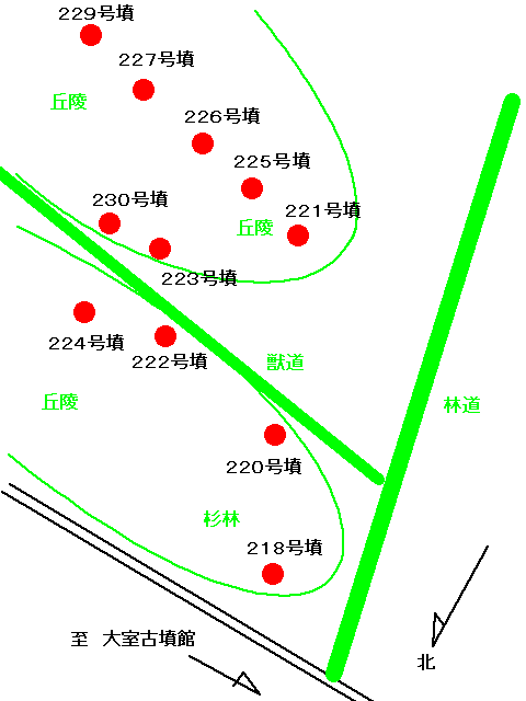 | 古墳館から右奥に延びる遊歩道を100mほど進むと、 右手に林道が分岐しています。 そちらに入ってすぐ左の杉林内に、218号墳が あります。