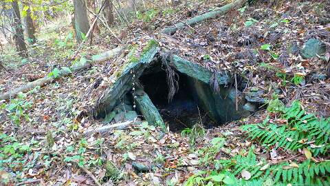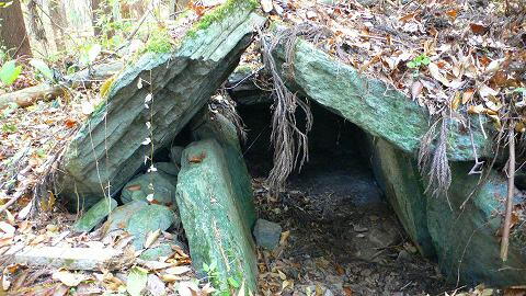 | 356号墳の奥に並ぶようにして、合掌形石室が残って います。 これが357号墳。 直径12.0m、高さ2.4mの積石塚の円墳だそうです。