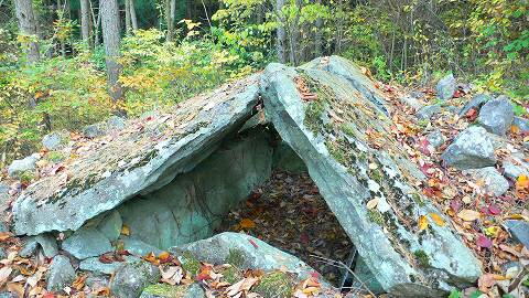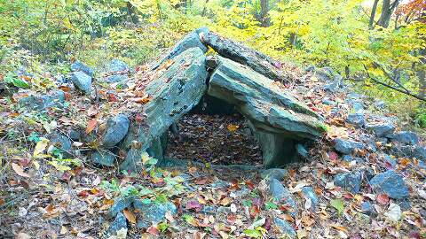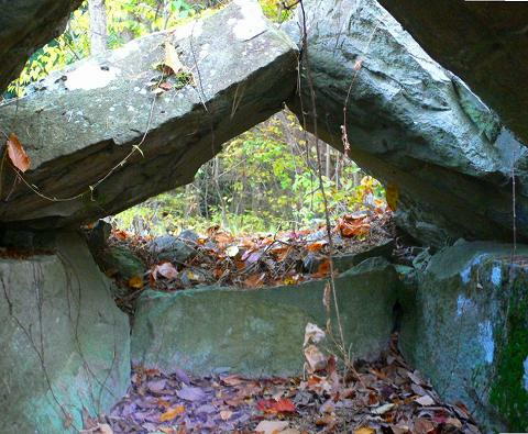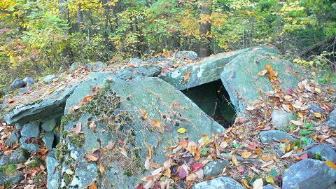 あいかわらず((((;゚Д゚)))ガクガクブルブルな重なり具合。 資料によると、「天井石が傾斜に沿って石室内に落ちる」 とあるが・・・