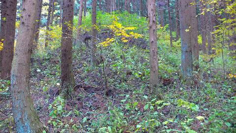 | 林道の山手側に、小山のような墳丘が残っています。 これが317号墳。 直径12.3〜12.5m、高さ3.5mの積石塚。