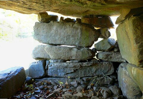 奥壁、側壁とも長方形に整形した割石を横積みにして います。 天井石も平板な巨石なのですが、それを受けてる 石材の小ささが・・・