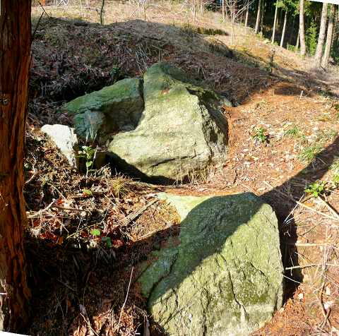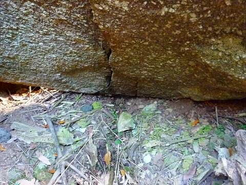 | 玄室後部の天井部分が僅かに開口し、ここから何とか 入室可能。 左手の巨石がポッキリ逝っちゃってるのが・・・