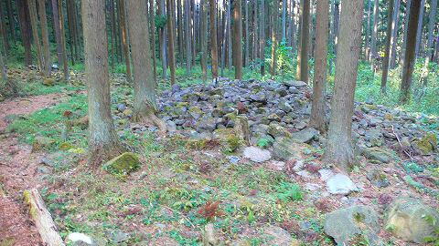 この辺りから遺跡復元整備ゾーンになるらしく、整備 された古墳が連なっています。 直径10〜11.5m、高さ2.5mの積石塚。
