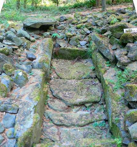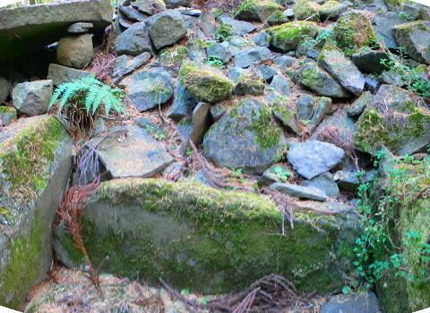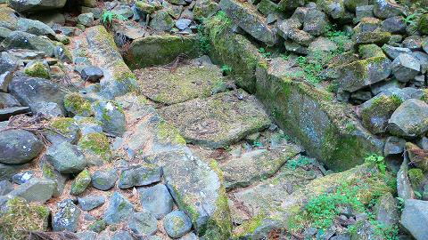 石室長2mほど、幅1m弱か。 この古墳、以前は埋もれていたらしく資料には石室の サイズが記載されていません。 床面に板石を敷きつめ、側壁に平たい石材を縦積みに している形式は、合掌式石室を想定させます。 左上の石材が天井石。