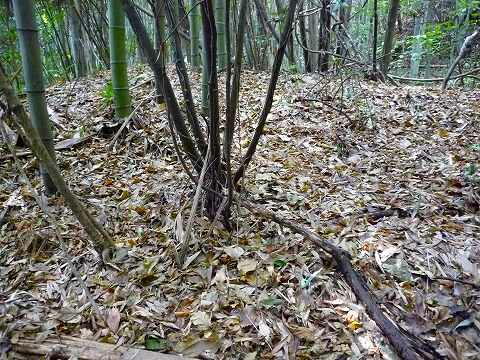 | 7号墳ですが、この7号・8号墳は先ほどの1〜6号墳 とはだいぶ離れてます。 県道から丘陵東の農道に入って50mほど南下すると、 東の農地に向って細い農道が通ってます。 その農道の分岐点の西側、丘陵東斜面の竹林内に あります。