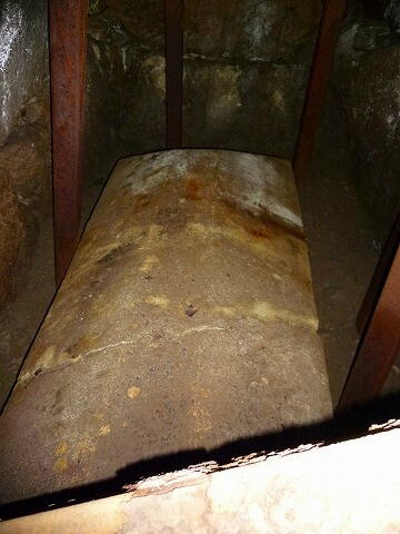 刳貫式家形石棺。 凝灰岩製だそうで、どこからか運ばれてきたのかな・・・? 見てのとおり、蓋と棺身のバランスが悪く、まるで大きな キノコみたいな状態に・・・
