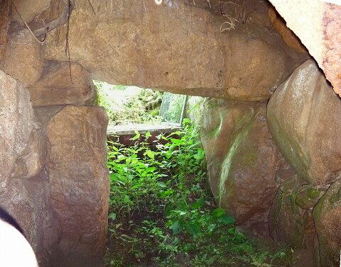 長さは割とあるのですが、石棺と補強の鉄骨のせいで 狭く感じます。 石材は大きめの自然石を乱石積み。 側壁は幾分持ち送ってるかな・・・