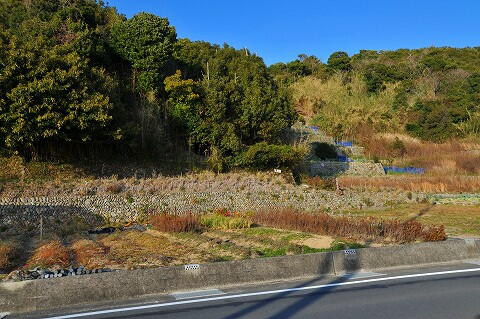 | 丘陵の西突端、国道際の石垣に小さく古墳群の標識が 出てます。
