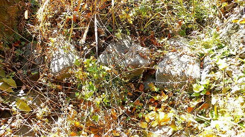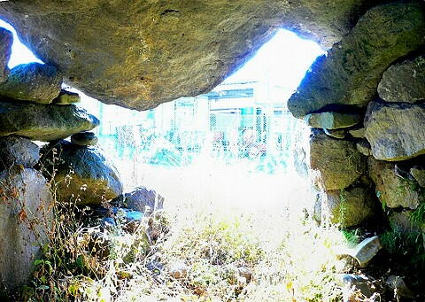 側壁は割石の乱石積み、奥壁には巨大な鏡石を据えて
