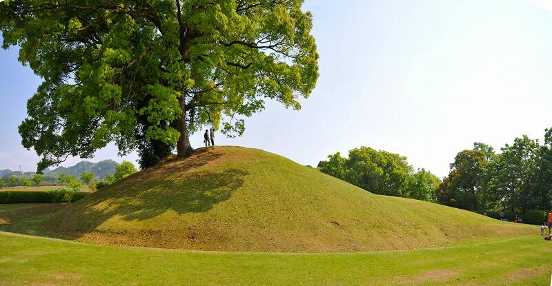 左の写真は、復元された前方部から後円部。