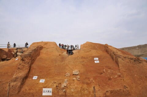 地山の上の盛土には版築でつき固められた地層が