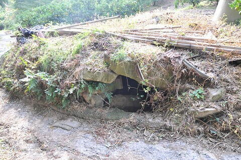 農道で墳丘が削られ石室が露出。