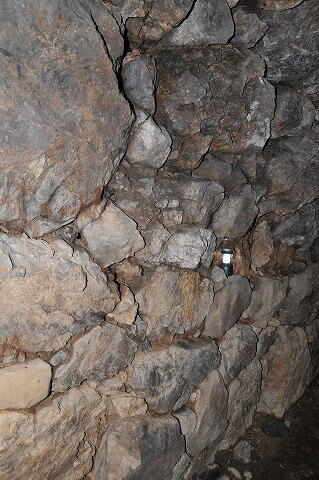 玄室も幅が狭い。 幅1.7m、高さ2.6m、玄室長3.6m。 奥壁の形状に沿って側壁が大きく持ち送ってます。 これはなかなか・・・